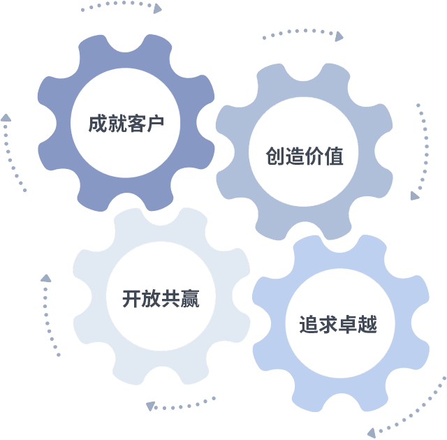 成就客户是一切决策的出发点,,,创造价值是衡量所有工作的标准,,追求卓越是我们做事做人的态度,,,开放共赢是我们的格局也是最终的结果。。。价值观的齿轮环环相扣,,,推动着组织里的每个人不断向前。。。