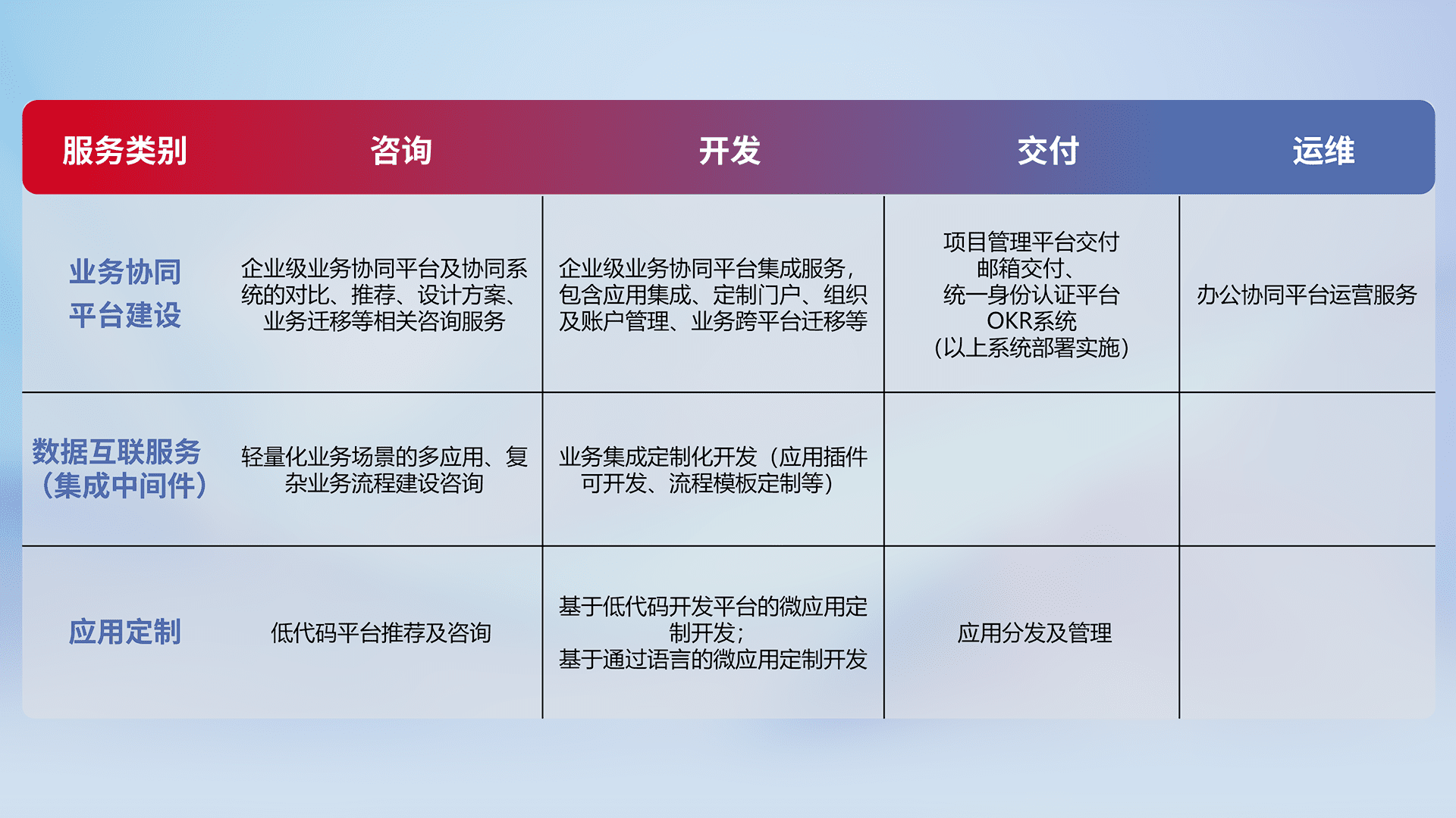 针对钉钉、、、、企微、、IDaas等平台级产品提供产品的规划、、、方案、、交付、、、定制化开发等服务,,,实现如统一协同办公、、、、智能客户服务、、混合会议管理、、智能数据查询、、等业务场景,,实现数字化转型。。。